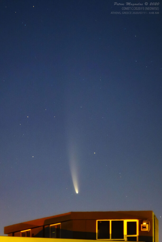Άλλη μια άποψη από το αξέχαστο πέρασμα του ουράνιου επισκέπτη. Η συγκεκριμένη λήψη έγινε από την ταράτσα του σπιτιού μου στην Αθήνα στις 11 Ιουλίου 2020, ώρα 4:48 το πρωί. Χρησιμοποίησα την ίδια κάμερα Canon 6D, αλλά αυτή τη φορά με φακό Jupiter 21M 200mm F4.0 για ακόμη μεγαλύτερο “ζουμάρισμα” επάνω στον κομήτη. Περισσότερες τεχνικές λεπτομέρειες γι αυτή τη λήψη μπορείτε να δείτε στο τέλος της σελίδας.